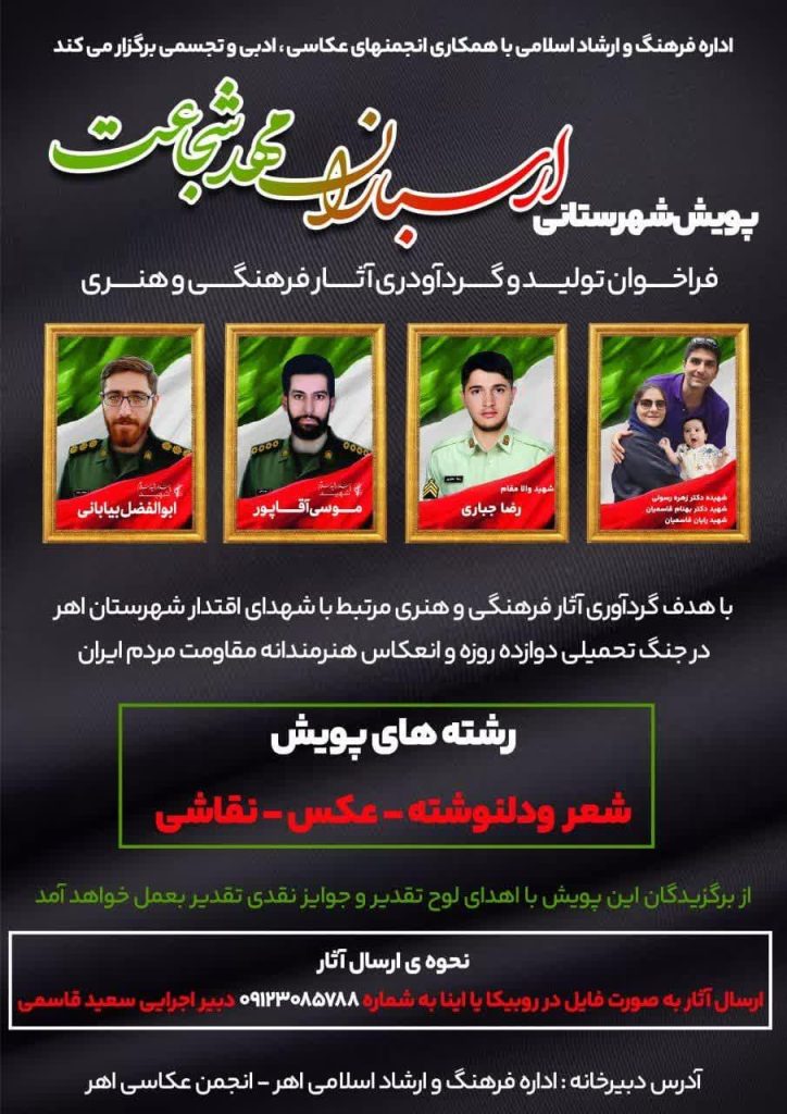 به گزارش اهرامروز، اداره فرهنگ و ارشاد اسلامی اهر با همکاری انجمن های عکاسی، ادبی بارز و انجمن تجسمی و با هدف گردآوری آثار مرتبط با شهدای مدافع وطن شهرستان اهر و انعکاس هنرمندانه ایثار، پایداری و مقاومت مردم ایران در برابر دشمنان این سرزمین مقدس برگزار میکنند.